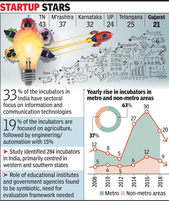 The study carried out by IIM-A assistant professor Neharika Vohra and CIIE.CO partner Supriya Sharma says that compared to metro cities, the growth rate of incubators in non-metro centres was very high. Analysis of the incubators also suggested that over 60% of the Indian setups were housed within educational institutes. The rest were supported by businesses, industry bodies, or ministries.