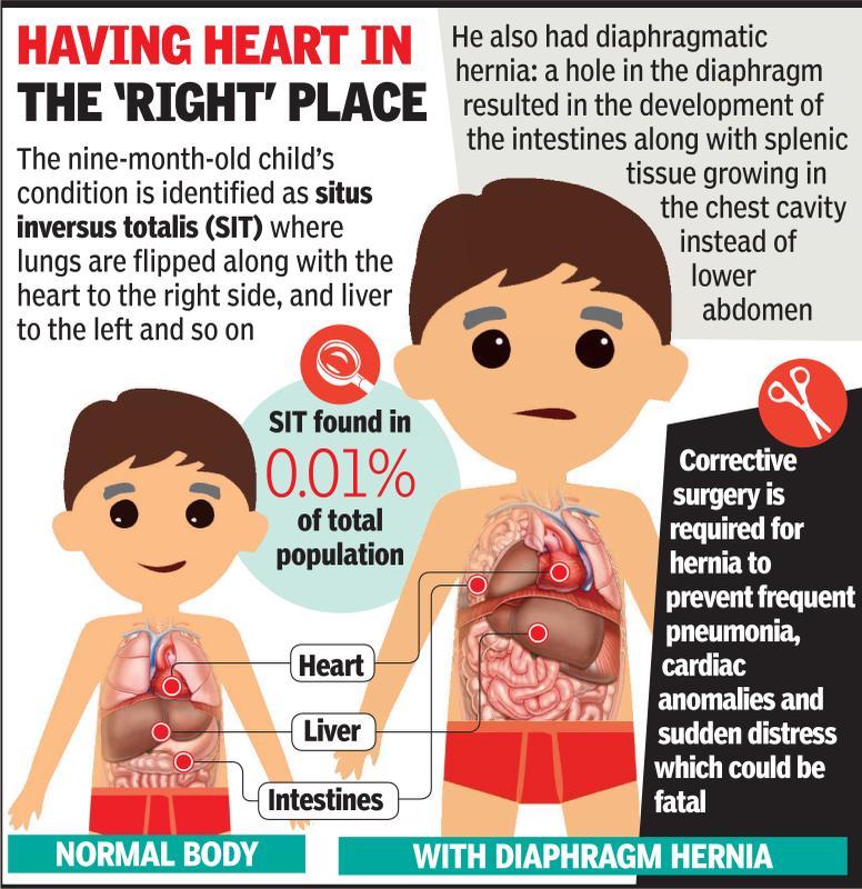 Dr Rakesh Joshi, professor and head of paediatric surgery at Civil Hospital, said this was the first surgical procedure at the hospital during his tenure where an infant was found to have these conditions together. While diaphragmatic hernia is very unusual but not rare in newborns, mirrored organs are found in just 0.01% of the population, Joshi said.