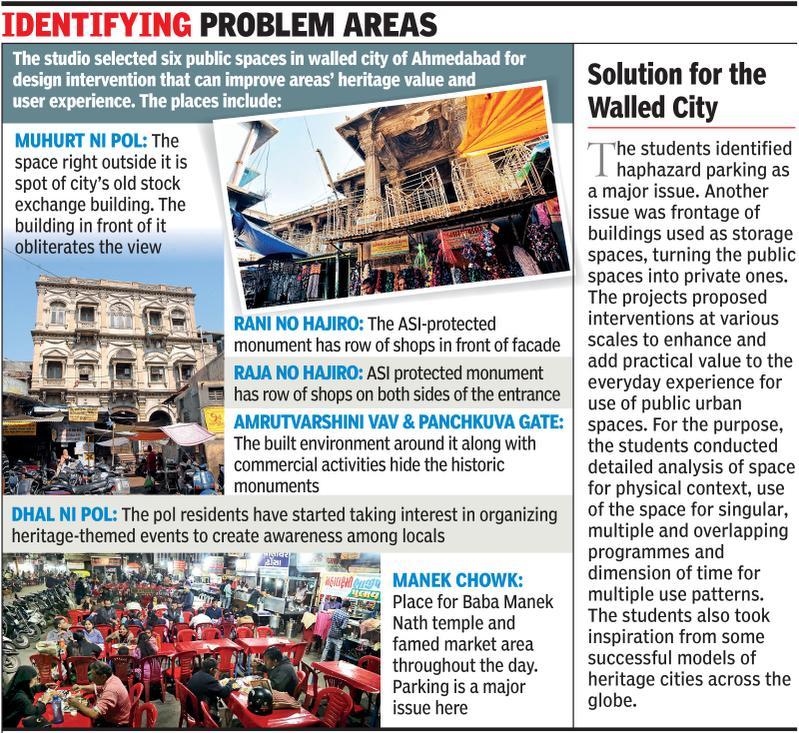 “We did not get into conventional legal/illegal debate and also refrained from using word ‘encroachment.’ Motive of the exercise was to give sensitive solutions to the usages of these spaces with better seating spaces, removal of parking and dignified spaces for living and working,” said Mansi Shah, an architect and tutor for the course. “The outcome aims at restoring heritage value while ensuring that the city gets a good public space.”