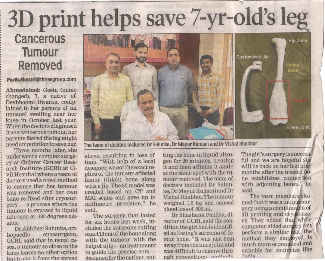 AHMEDABAD: Geeta (name changed), 7, a native of Devbhoomi Dwarka, complained to her parents of an unusual swelling near her knee in October last year. When the doctors diagnosed it as a cancerous tumour, her parents feared the leg might need amputation to save her.