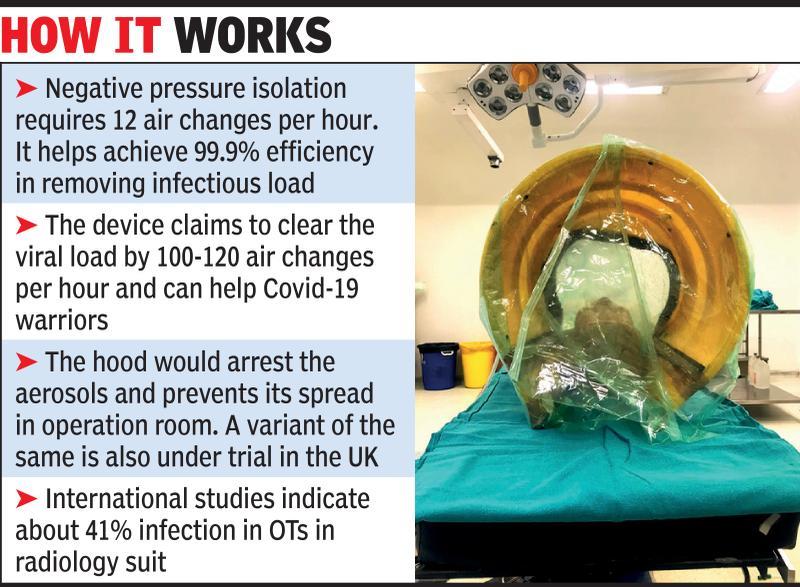 Dr Gaur, lead inventor for the device, said that the project could be defined as a simple solution for complex problem. “Advanced healthcare systems have concept of negative pressure operation theatres (OTs) for management of airborne contagious diseases. It’s different than the normal OTs as its pressure is lower than the adjoining areas, causing the air to flow from higher pressure to lower pressure area, changing the air inside,” he said. This helps in reducing the infectious viral load leaking out to reduce the indoor hospital pollution. “But not all hospitals can afford to get such OTs. Thus, the idea was to create a small enclosure that can function exactly like the negative pressure chamber.”