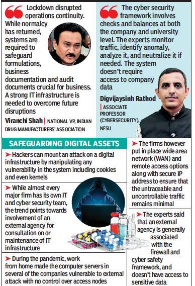 “Several pharmaceutical firms based in Ahmedabad and elsewhere did not even allow digital devices such as pen drives to be brought onto the premises in order to safeguard sensitive information like details of R&D projects, products under development, and intellectual property including formulations,” said Sunny Vaghela, CTO of a city-based cyber security firm looking after the security of a pharmaceutical major. “But Covid-19 changed the scenario with employees being forced to work from home. The firms had to deal with external traffic and ensure that communication remains secure,” added Vaghela.