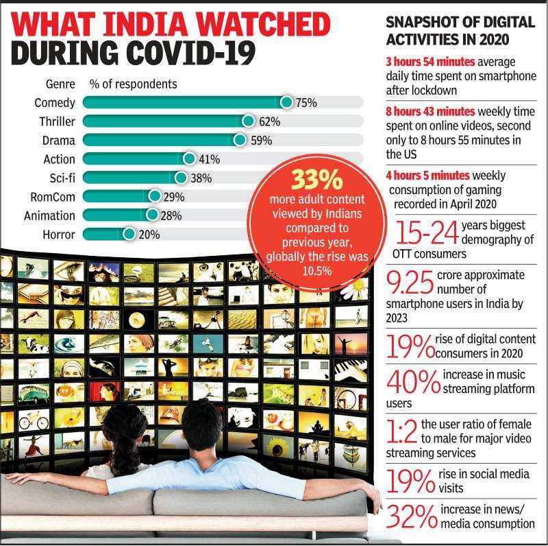 AHMEDABAD: Cooped up at home, juggling between domestic chores and office assignments, what did India do with smartphones? The Indian OTT Platforms Report 2020 by MICA and Communications Craft revealed that the average respondent of the survey spent about 3 hours and 54 minutes on their smartphones, and watched videos for 8 hours 43 minutes every week on an average.