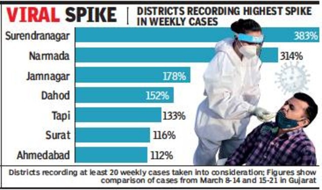 AHMEDABAD: Analysis of weekly cases in Gujarat reveals that the state recorded a spike of 82% in seven days – higher than the Covid-19 surge in the post-Diwali period. In fact, 10 out of 33 districts or 30% of the state districts at least doubled the cases. Only two districts – Anand (-9.8%) and Gir Somnath (-17.9%) – recorded negative trends, whereas 31 recorded rise in the cases.