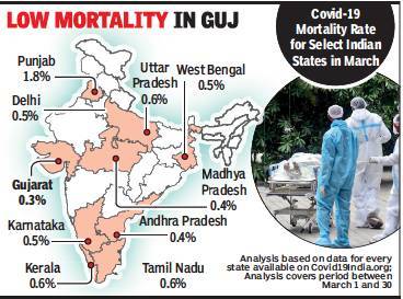 However, compared to other states, the mortality rate of Gujarat in March was one of the lowest at 0.3%, meaning death of three positive patients per 1,000 confirmed cases. Among the major states, Punjab topped the tally with1.8% mortality rate.
