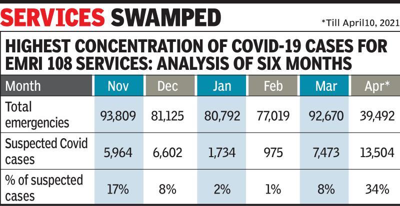 EMRI officials said that April has remained their busiest month so far in the pandemic. “Compared to 24% calls of the total calls to 108 in September – which was the earlier high –in April so far, 34% of the calls are about suspected Covid-19 patients. If we see daily calls, the average calls in November – the month of earlier surge –was the highest at 3,217. In the first 10 days of April, we are fielding 3,967calls,” said a senior official.