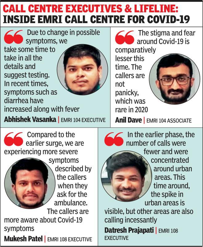 Ahmedabad: A visit to the call centre of EMRI at Kathwada looks like a frantic operation – the calls never cease to ring as the executives of EMRI 108 and 104 (fever helpline) get questions from across Gujarat about Covid-19 and dispatch ambulances to take them to hospitals.