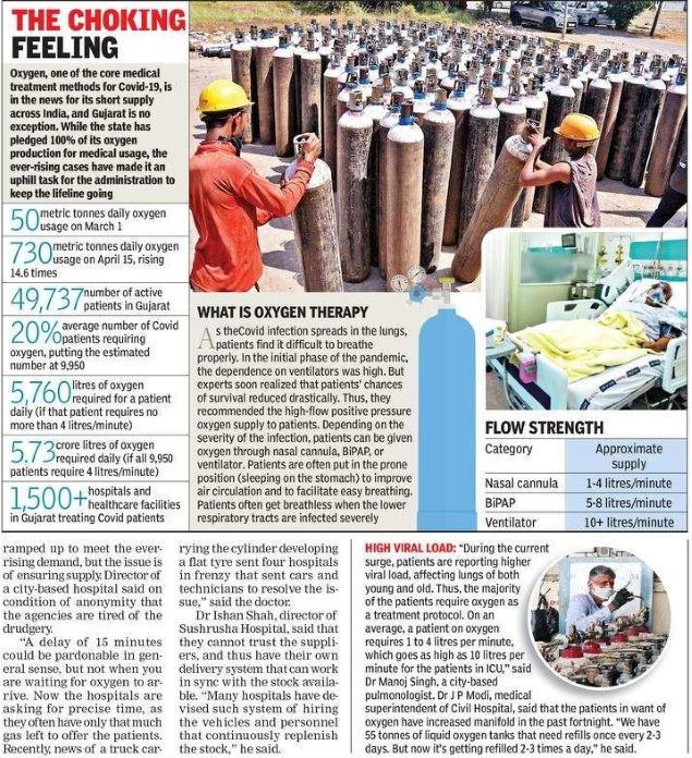 EMRI 108 sources said that several such patients ended up at Civil Hospital in the city due to want of a bed with oxygen. The state government had recently told the Gujarat high court that from 50 tonnes a day, the requirement has shot up to 710 tonnes, forcing the manufacturers on a 24-hour production cycle to meet demand.