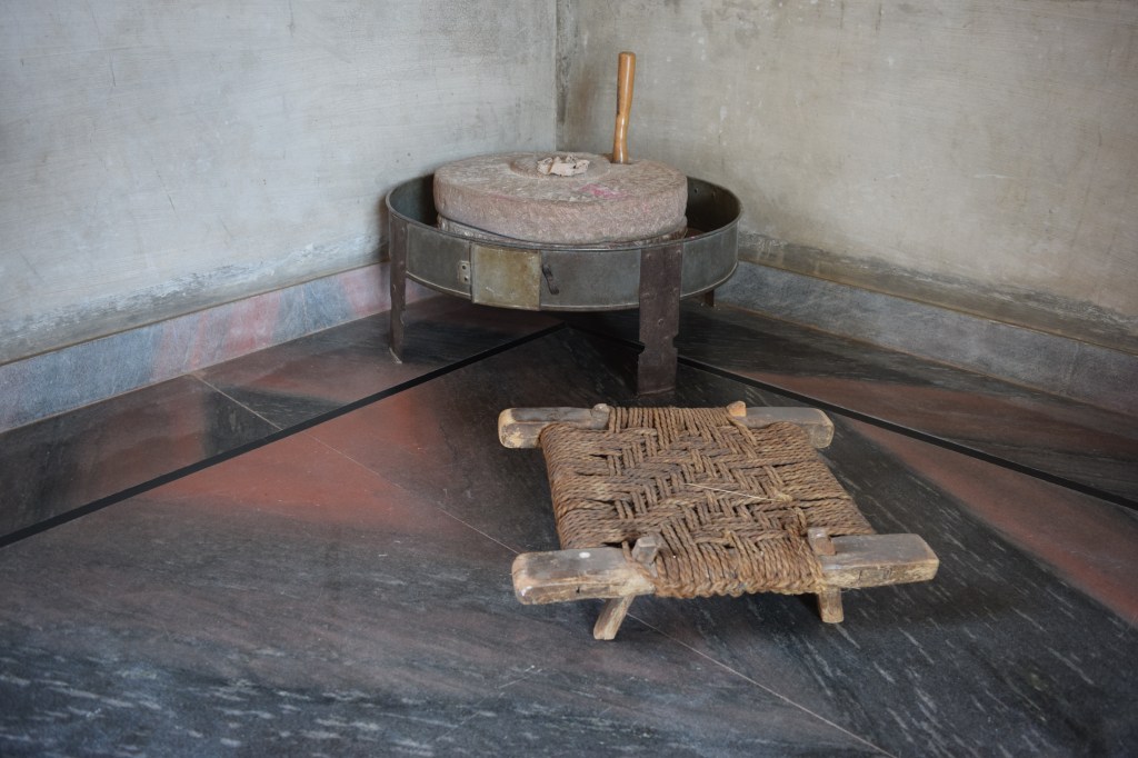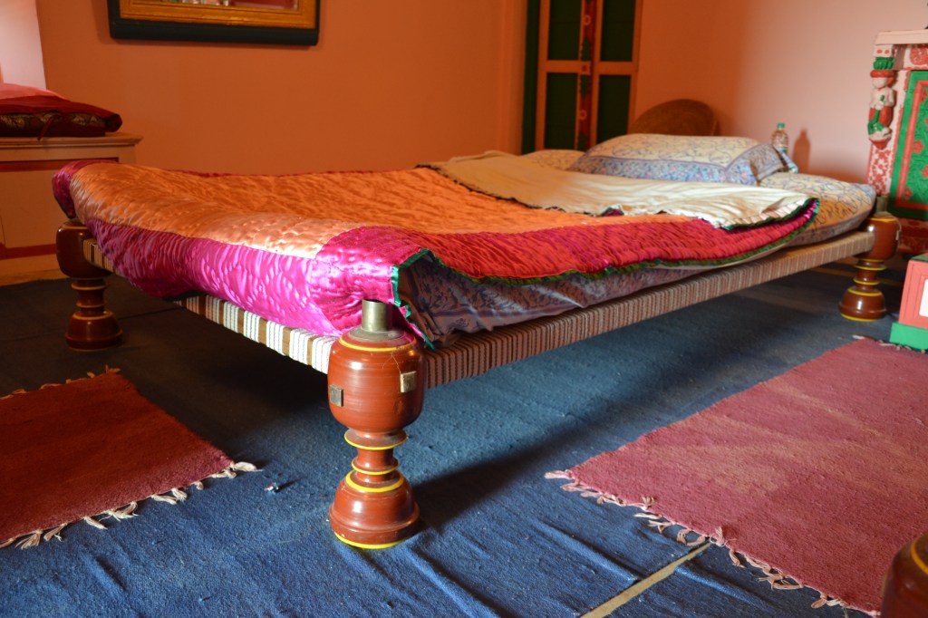 Found mostly in Saurashtra region of Gujarat, Dholiyo is distinct from khatlo (khaat) due to heavily-turned legs finished with characteristic red lacquer. Its surface is made of tightly-woven cotton straps, often covered with fabric sleeve or cover which is also decorated with embroidery or applique. In some communities, the charpoy is associated with a single male member of the family who uses it throughout his life. Its association is so deep that it’s cremated along with the person or is dismantled forever. In some communities, it used to form bride-wealth. The modern examples have brass fittings to accommodate mosquito net.