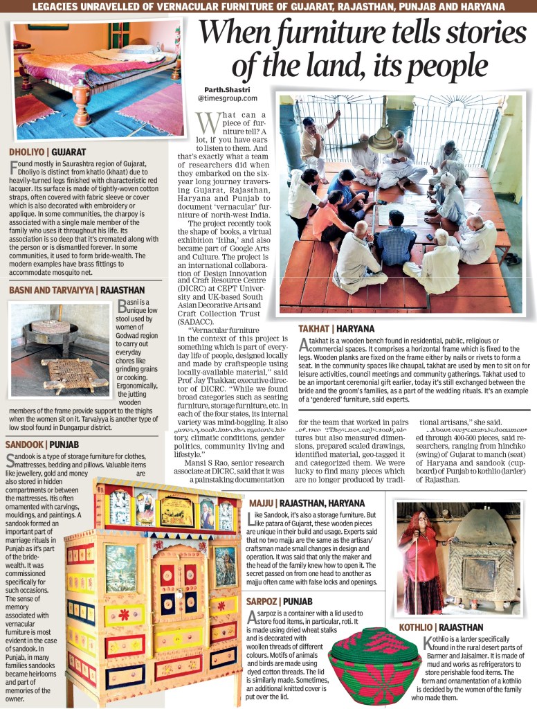Ahmedabad: What can a piece of furniture tell? A lot, if you have ears to listen to them. And that’s exactly what a team of researchers did when they embarked on the six-year long journey traversing Gujarat, Rajasthan, Haryana and Punjab to document ‘vernacular’ furniture of north-west India.