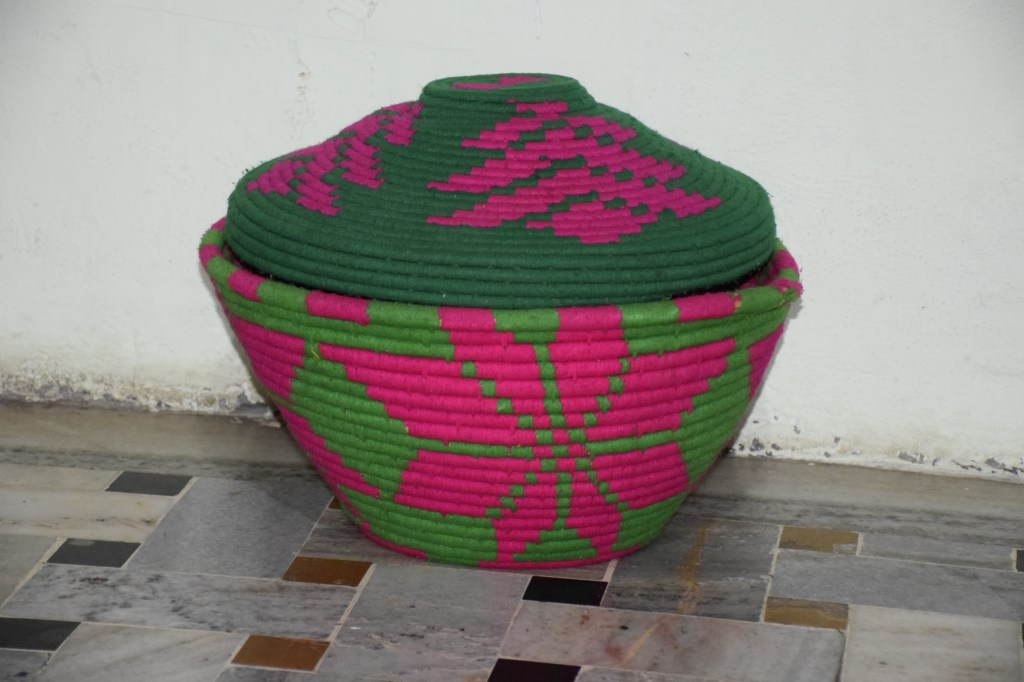 A sarpoz is a container with a lid used to store food items, in particular, roti. It is made using dried wheat stalks and is decorated with woollen threads of different colours. Motifs of animals and birds are made using dyed cotton threads. The lid is similarly made. Sometimes, an additional knitted cover is put over the lid.