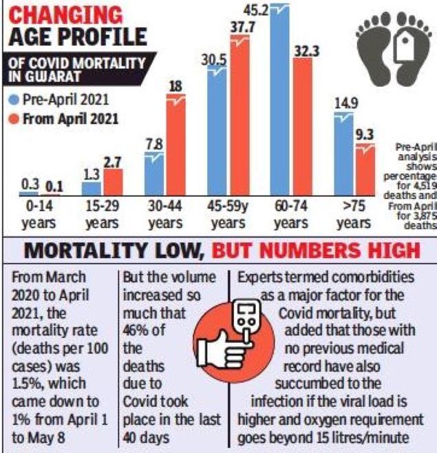 AHMEDABAD: The current wave of Covid-19 in Gujarat has proved to be more fatal for the younger population. An analysis of the mortality during the pandemic reveals that 58.4% of the deaths since April 1 have been reported in the below 60 years age group. To put the figure in perspective, it was 40% from March 2020 to April 2021.