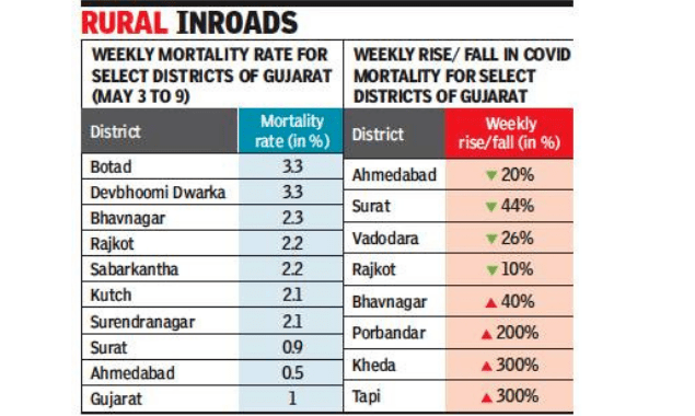 (33.5%), Aravalli (35.7%), Panchmahal (55%), etc. recorded steep rise in cases, and Bhavnagar (40%), Porbandar (200%) Kheda (300%), etc. recorded rise in deaths compared to the previous week.