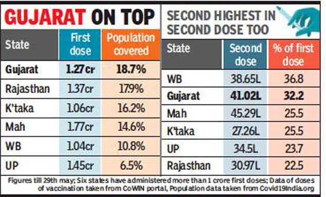 Likewise, analysis of the second shot – completing the two-dose vaccine for both Covishield and Covaxin, the two vaccines administered so far – among the states with 1 crore-plus vaccines reveal that Gujarat ranked second with 32.2% behind West Bengal’s coverage of 36.8% of those who have already taken the first dose.