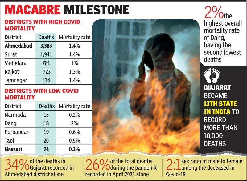 AHMEDABAD: Till April 2021 – when the state began to feel the second wave of the Covid-19 pandemic in full force, the four major districts of Ahmedabad, Surat, Vadodara and Rajkot accounted for 85% of the total Covid deaths. The surge proved to a great equalizer, as the share of the four districts in the next 5,000 cases fell to 55%.