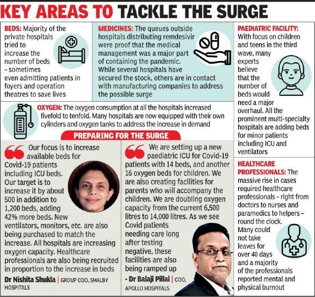 The second wave thus brought in several changes in approach of private hospitals especially in procuring oxygen, upgrading infrastructure, and getting matching human resources. Currently, about 110 hospitals treat Covid-19 patients in the city. They are gradually reducing the number of beds to make space for post-Covid patients and for planned medical procedures.