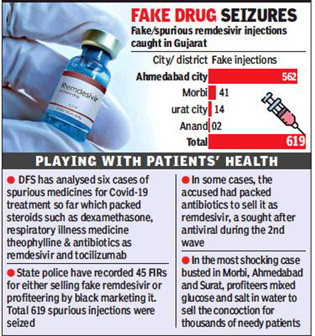 AHMEDABAD: What did the spurious injection vials of tocilizumab and remdesivir contain which were sold for thousands of rupees to desperate kin of Covid patients at the peak of the pandemic in April and May in Gujarat? State police investigators and forensic sciences experts say the drugs contained anything from steroids to salt – giving no respite to the patients and posing a grave health hazard.