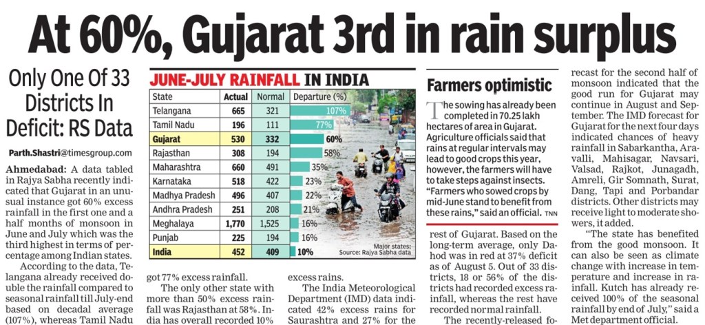 Ahmedabad: A data tabled in Rajya Sabha recently indicated that Gujarat in an unusual instance got 60% excess rainfall in the first one and a half months of monsoon in June and July which was the third highest in terms of percentage among Indian states.