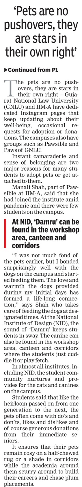The pets are no push-overs, they are stars in their own right – Gujarat National Law University (GNLU) and IIM-A have dedicated Instagram pages that keep updating about their well-being, occasional requests for adoption or donations. The campuses also have groups such as Pawsible and Paws of GNLU.