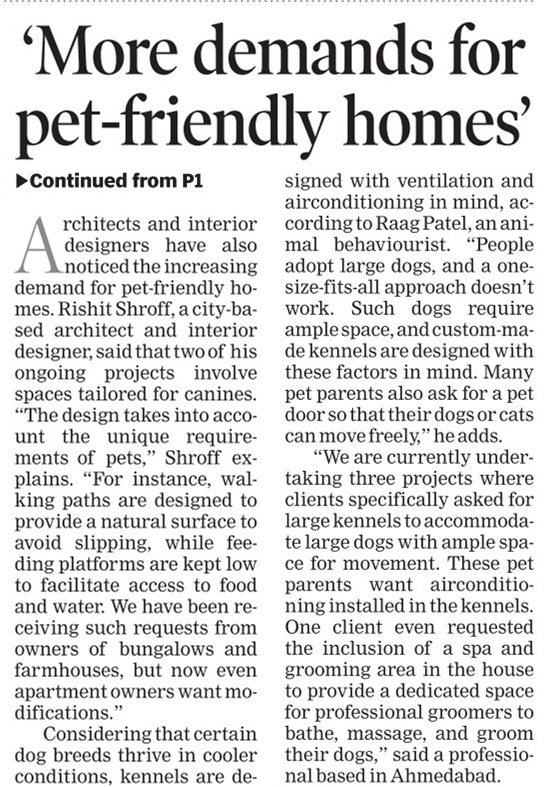 Architects and interior designers have also noticed the increasing demand for pet-friendly homes. Rishit Shroff, a city-based architect and interior designer, said that two of his ongoing projects involve spaces tailored for canines. “The design takes into account the unique requirements of pets,” Shroff explains. “For instance, walking paths are designed to provide a natural surface to avoid slipping, while feeding platforms are kept low to facilitate access to food and water. We have been receiving such requests from owners of bungalows and farmhouses, but now even apartment owners want modifications.”