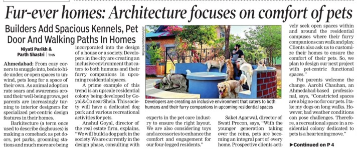 Saket Agarwal, director of Swati Procon, says, “With the younger generation taking over the reins, pets are becoming an integral part of every home. Prospective clients actively seek open spaces within and around the residential campuses where their furry companions can walk and play. Clients also ask us to customize their homes to ensure the comfort of their pets. So, we plan to design our next project with pet-centric functional spaces.”