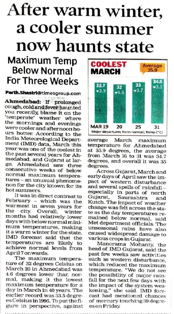 The maximum temperature of 32 degrees Celsius on March 20 in Ahmedabad was 4.6 degrees lower than normal, making it the lowest maximum temperature for a day in March in 40 years. The earlier record was 33.5 degrees Celsius in 1995. To put the figure in perspective, against average March maximum temperature for Ahmedabad at 35.9 degrees, the average from March 16 to 31 was 34.7 degrees, and overall it was 35 degrees.