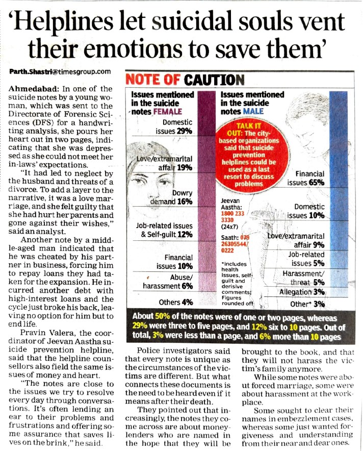 Pravin Valera, the coordinator of Jeevan Aastha suicide prevention helpline, said that the helpline counsellors also field the same issues of money and heart.