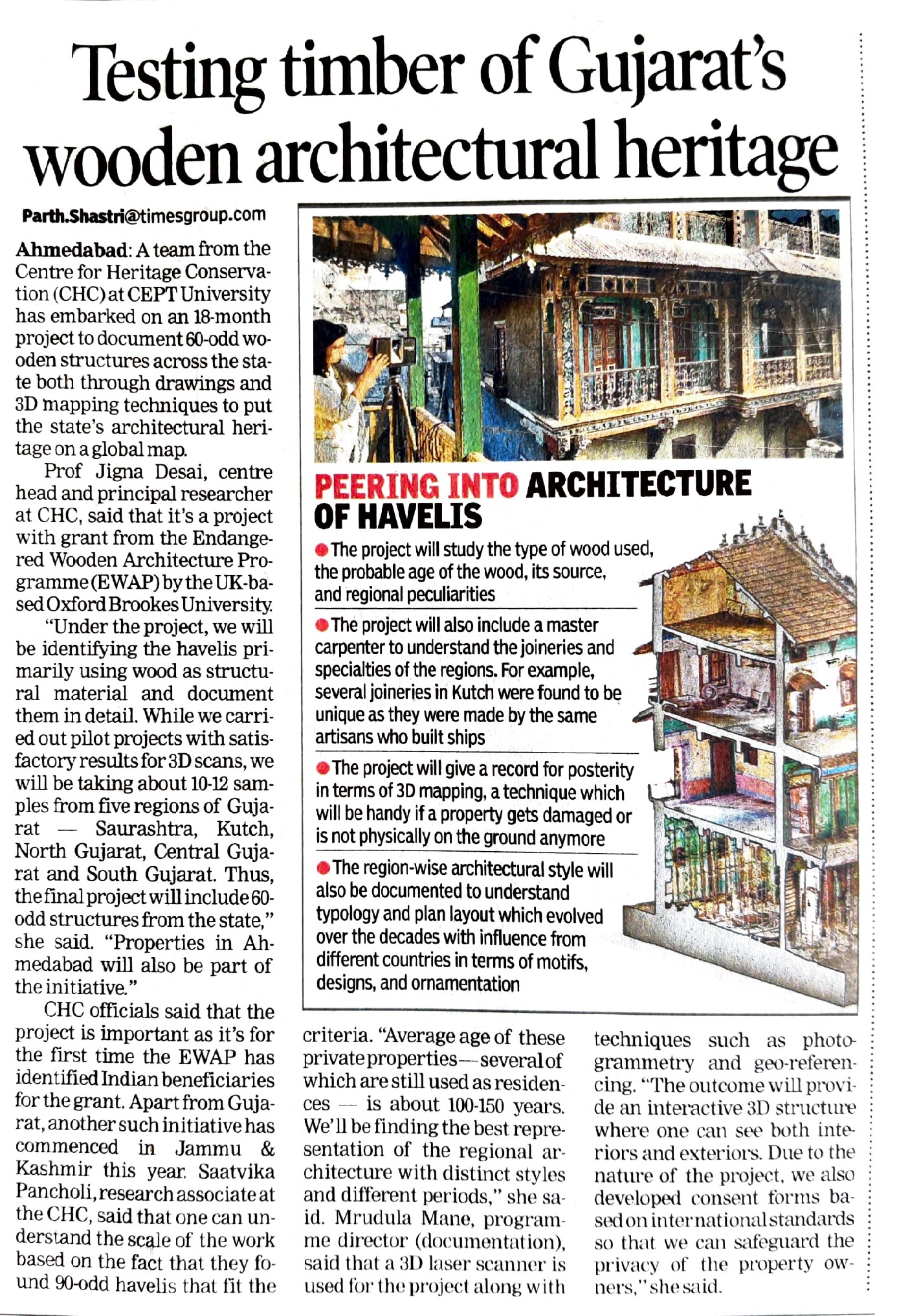 AHMEDABAD: A team from the Centre for Heritage Conservation (CHC) at CEPT University has embarked on an 18-month project to document 60-odd wooden structures across the state both through drawings and 3D mapping techniques to put the state’s architectural heritage on a global map.