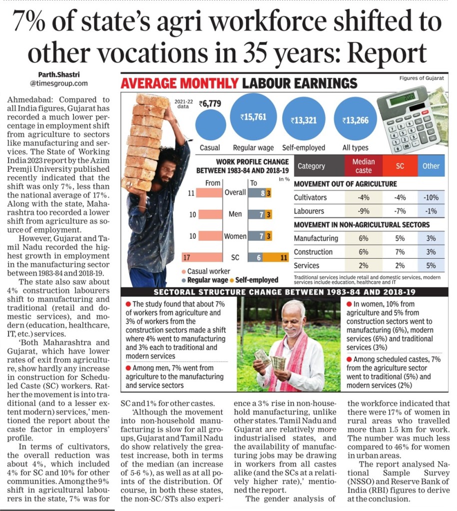 Ahmedabad: Compared to all India figures, Gujarat has recorded a much lower percentage in employment shift from agriculture to sectors like manufacturing and services. The State of Working India 2023 report by the Azim Premji University published recently indicated that the shift was only 7%, less than the national average of 17%. Along with the state, Maharashtra too recorded a lower shift from agriculture as source of employment.