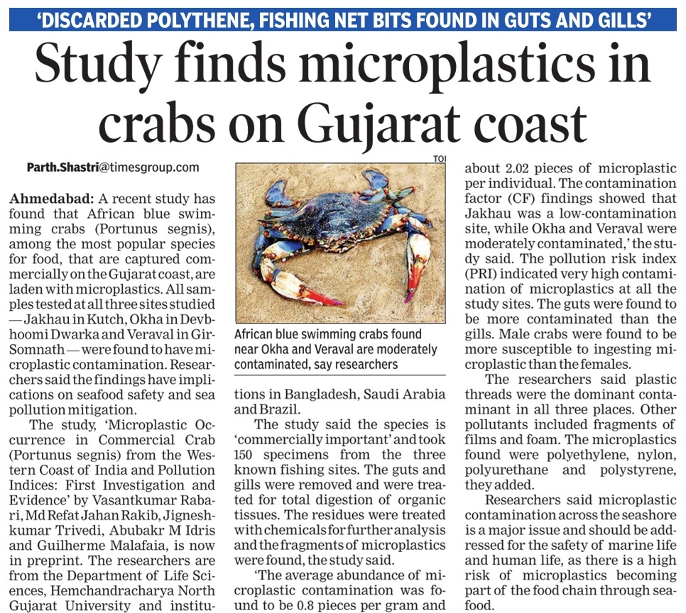 The study, ‘Microplastic Occurrence in Commercial Crab (Portunus segnis) from the Western Coast of India and Pollution Indices: First Investigation and Evidence’ by Vasantkumar Rabari, Md Refat Jahan Rakib, Jigneshkumar Trivedi, Abubakr M Idris and Guilherme Malafaia, is now in preprint. The researchers are from the Department of Life Sciences, Hemchandracharya North Gujarat University and institutions in Bangladesh, Saudi Arabia and Brazil.