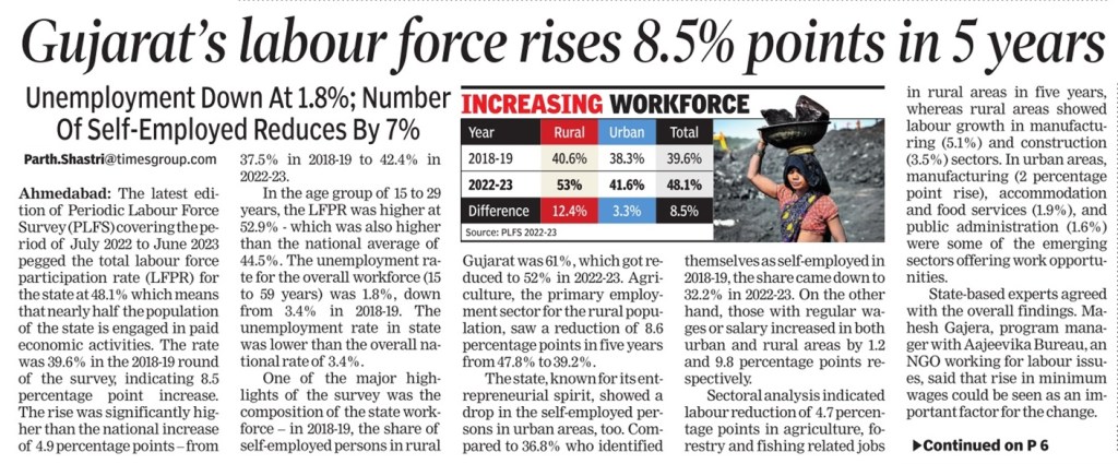 AHMEDABAD: The latest edition of Periodic Labour Force Survey (PLFS) covering the period of July 2022 to June 2023 pegged the total labour force participation rate (LFPR) for the state at 48.1% which means that nearly half the population of the state is engaged in paid economic activities.