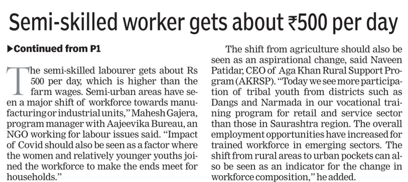 The semi-skilled labourer gets about Rs 500 per day, which is higher than the farm wages. Semi-urban areas have seen a major shift of workforce towards manufacturing or industrial units,” Mahesh Gajera, program manager with Aajeevika Bureau, an NGO working for labour issues said. “Impact of Covid should also be seen as a factor where the women and relatively younger youths joined the workforce to make the ends meet for households.”