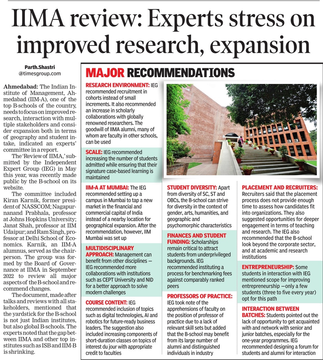 The committee included Kiran Karnik, former president of NASSCOM; Nagapurnanand Prabhala, professor at Johns Hopkins University; Janat Shah, professor at IIM Udaipur; and Ram Singh, professor at Delhi School of Economics. Karnik, an IIM-A alumnus, served as the chairperson. The group was formed by the Board of Governance at IIMA in September 2022 to review all major aspects of the B-school and recommend changes.