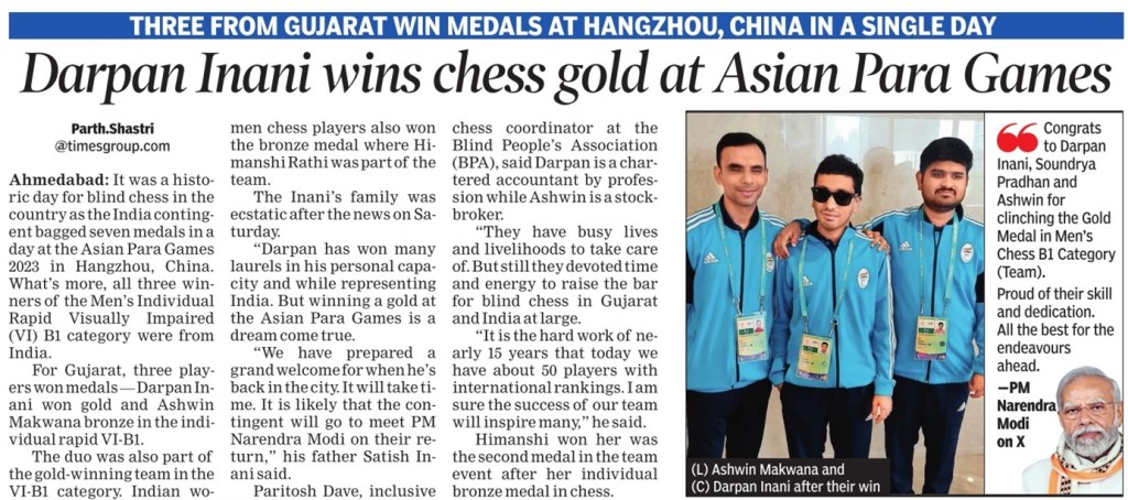 For Gujarat, three players won medals – Darpan Inani won gold and Ashvin Makwana bronze in the individual rapid VI-B1. The duo was also part of the gold-winning team in the VI-B1 category. Indian women chess players also won the bronze medal where Himanshi Rathi was part of the team.
