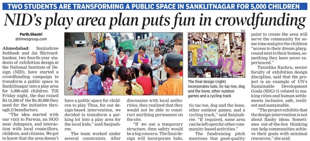 Ahmedabad: Sanjushree Subhash and Jai Shrivardhankar, two fourth-year students of exhibition design at the National Institute of Design (NID), have started a crowdfunding campaign to transform a public space in Sanklitnagar into a play area for 5,000-odd children. Till Friday night, the duo raised Rs 14,500 of the Rs 20,000 they need for the initiative through 11 benefactors.