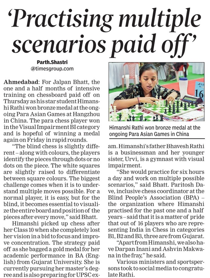 For Jalpan Bhatt, the one and a half months of intensive training on chessboard paid off on Thursday as his star student Himanshi Rathi won bronze medal at the ongoing Para Asian Games at Hangzhou in China. The para chess player won in the Visual Impairment BI category and is hopeful of winning a medal again on Friday in rapid rounds.