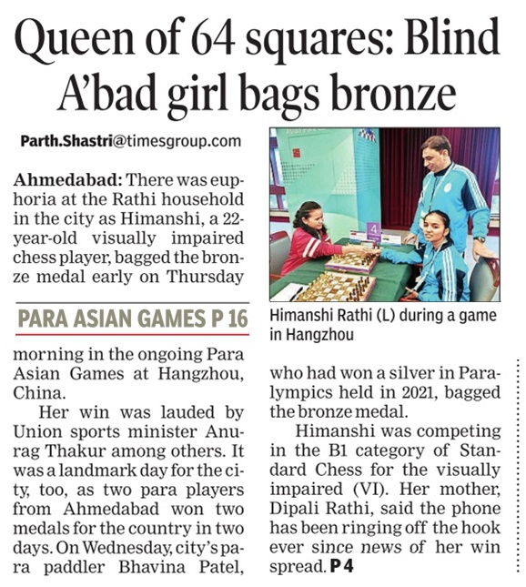AHMEDABAD: There was euphoria at the Rathi household in the city as Himanshi, a 22-year-old visually impaired chess player, bagged the bronze medal early on Thursday morning in the ongoing Para Asian Games at Hangzhou, China.