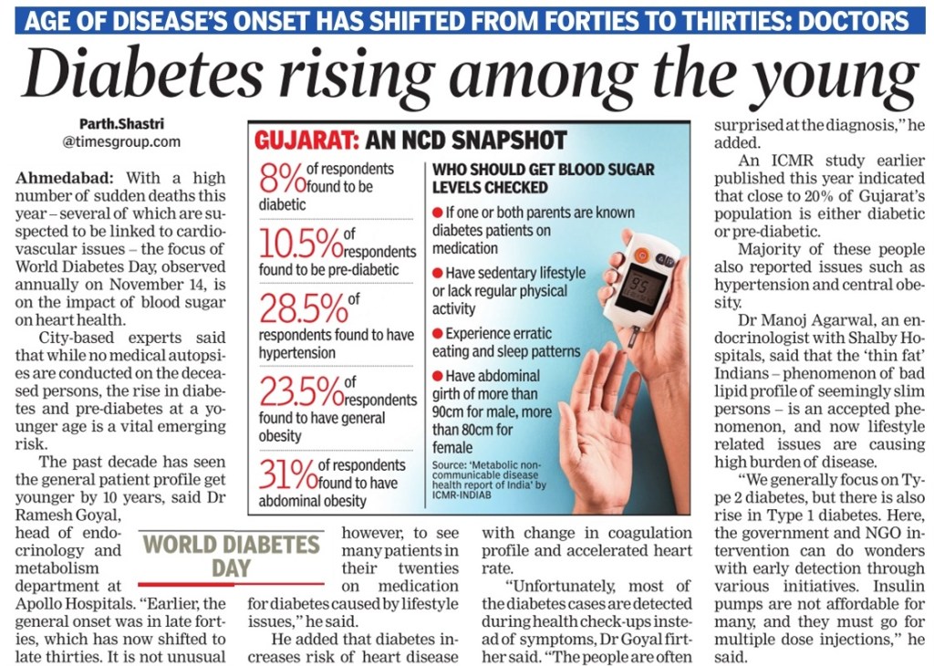 Ahmedabad: With a high number of sudden deaths this year – several of which are suspected to be linked to cardiovascular issues – the focus of World Diabetes Day, observed annually on November 14, is on the impact of blood sugar on heart health.