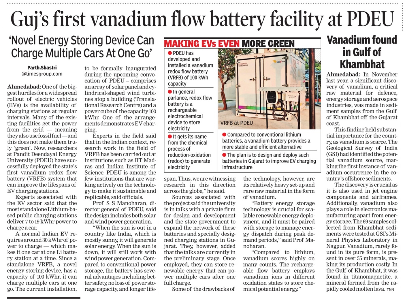 Experts in the field said that in the Indian context, research work in the field of VRFB has been carried out at institutions such as IIT Madras and Indian Institute of Science. PDEU is among the few institutions that are working actively on the technology to make it sustainable and replicable, said officials.