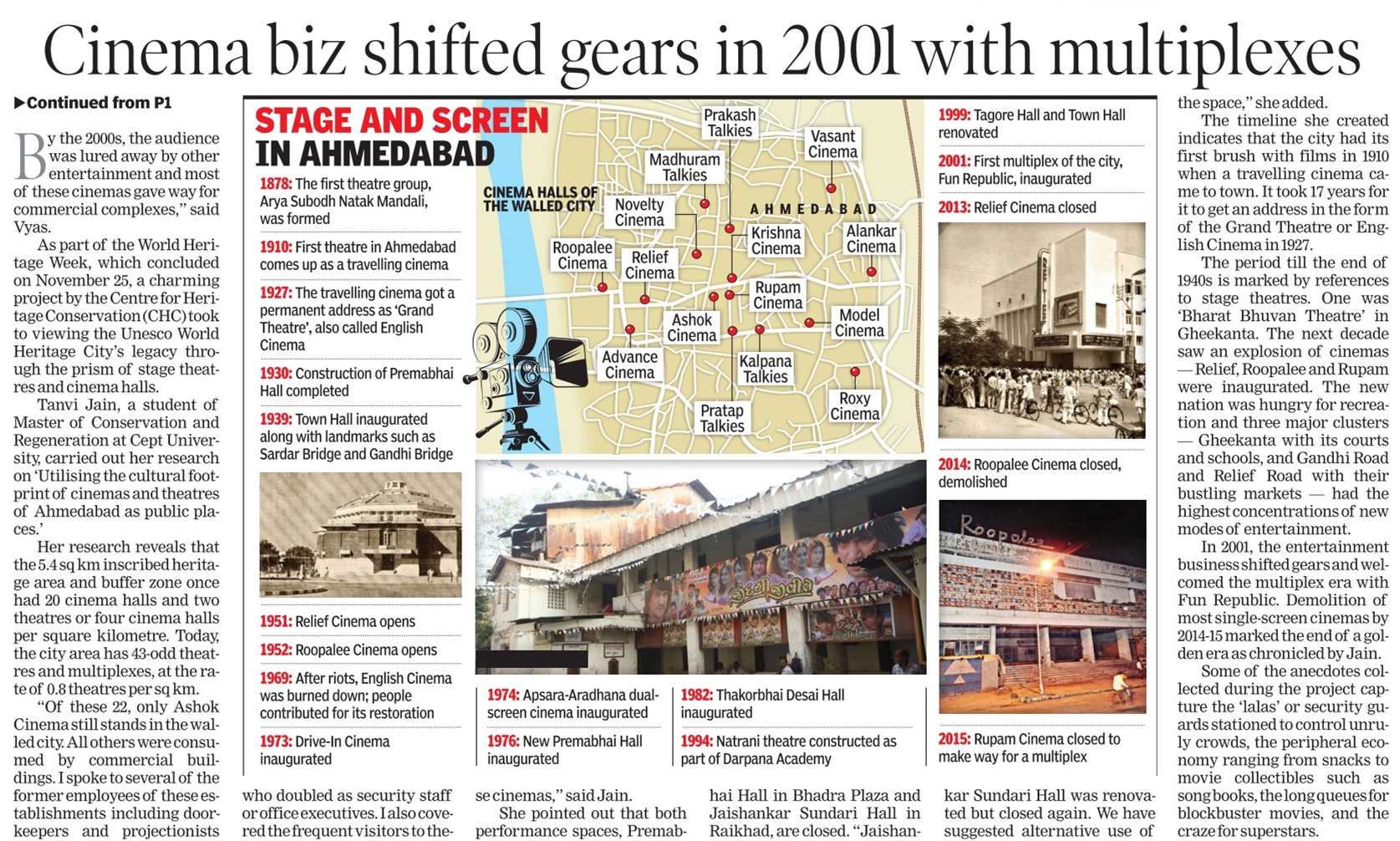 As World Heritage Week got over on November 25, a project by Centre for Heritage Conservation (CHC) took a different lens to look at the UNESCO World Heritage City’s legacy in the form of theatres and cinema halls. Tanvi Jain, a student of Master of Conservation and Regeneration (MCR) at CEPT University, carried out her research on the theme ‘Utilising the cultural footprint of cinemas and theatres of Ahmedabad as public places.’