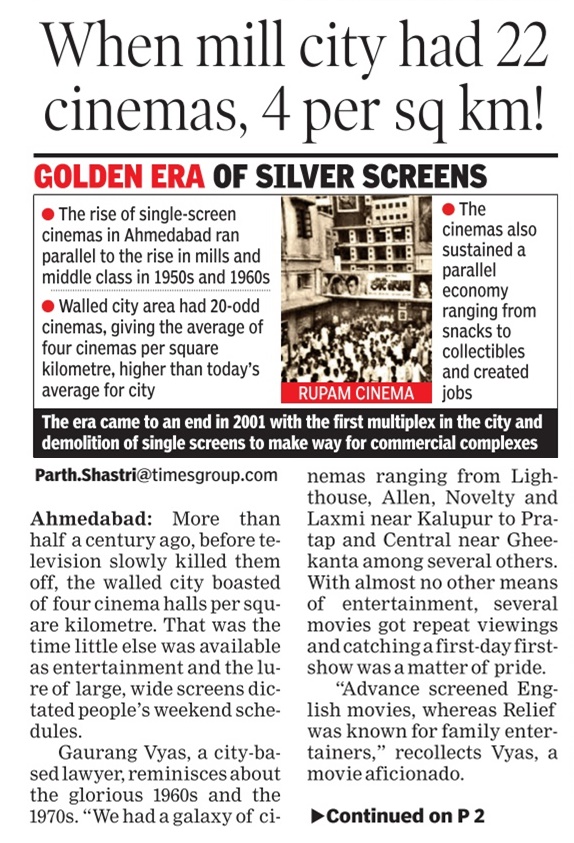 Gaurang Vyas, a city-based lawyer, reminisces about the glorious 1960s and 1970s. “We had a galaxy of cinemas ranging from Lighthouse, Allen, Novelty and Laxmi near Kalupur to Pratap and Central near Gheekanta among several others. With almost no other means of entertainment, several movies got repeat viewings and catching first-day-first-show was a matter of pride.