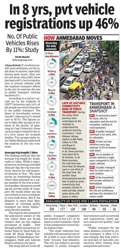 The experts also pointed at the polycentric nature of the city where there are 25-odd clusters that see the highest movement of traffic – both through public and private vehicles. Some of these hubs include SG Road, Bopal, Navrangpura, Prahladnagar, Navrangpura, Paldi and Ashram Road in western city parts.