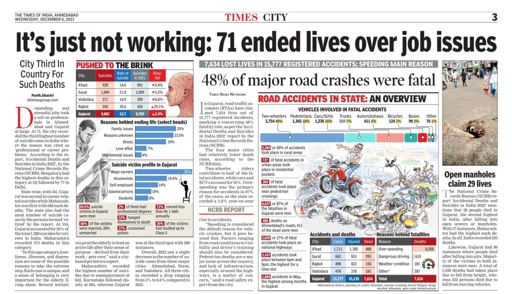 Demanding and stressful jobs took a toll on professionals in Ahmedabad and Gujarat at large. At 71, the city recorded the third highest number of suicide cases in India where the reason was cited as ‘professional or career problems.’ According to the report, ‘Accidental Deaths and Suicides in India 2022’, by the National Crime Records Bureau (NCRB), Bengaluru had the highest deaths in this category at 121 followed by 77 in Delhi.