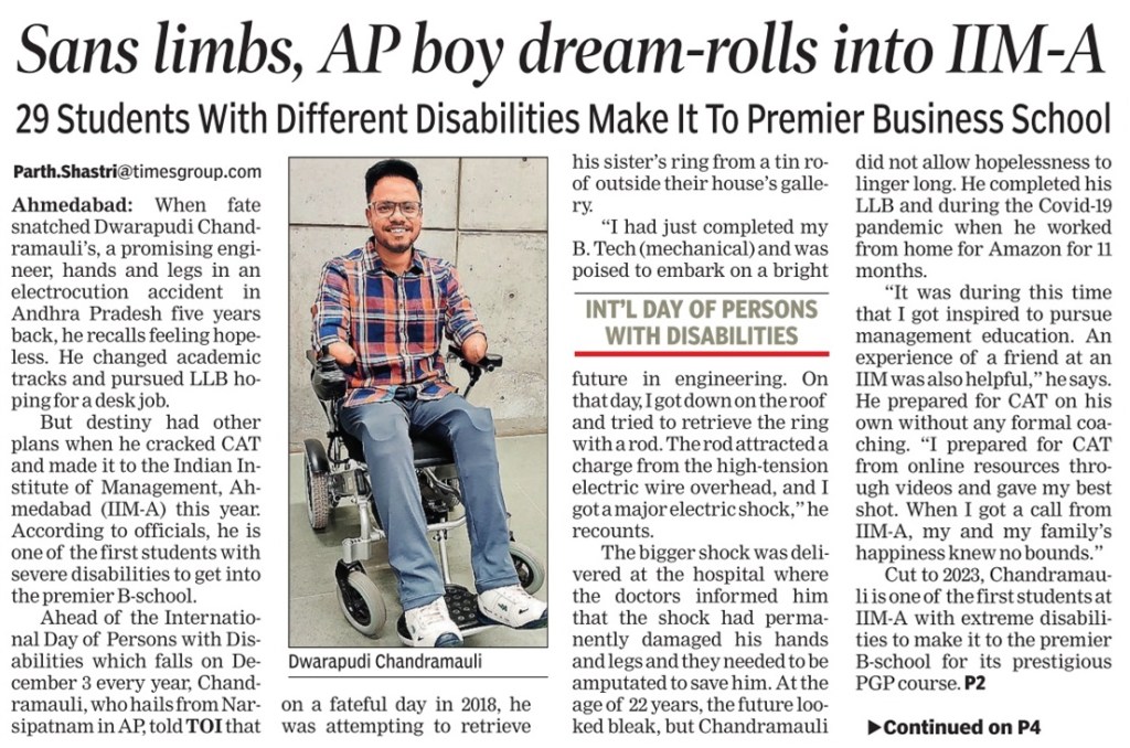 Cut to 2023, Chandramauli is one of the first students at IIM-A with extreme disabilities to make it to the premier B-school for its prestigious PGP course.
