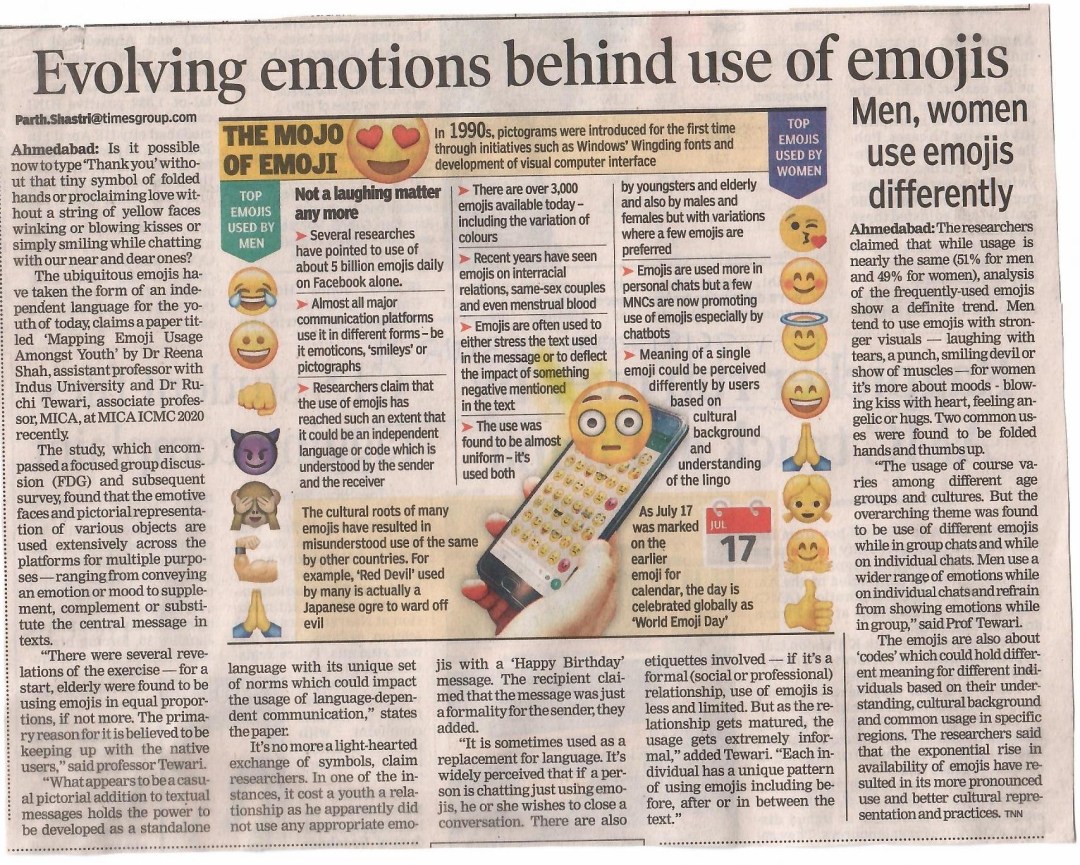 Published on January 16, 2020 AHMEDABAD: Is it possible now to type ‘Thank you’ without that tiny symbol of folded hands or proclaiming love without a string of yellow faces winking or blowing kisses or simply smiling while chatting with our near and dear ones? The ubiquitous emojis have taken the form of an independent … Continue reading Evolving emotions behind use of emojis